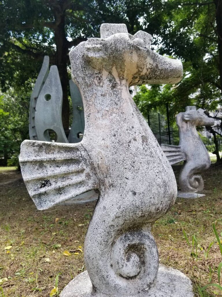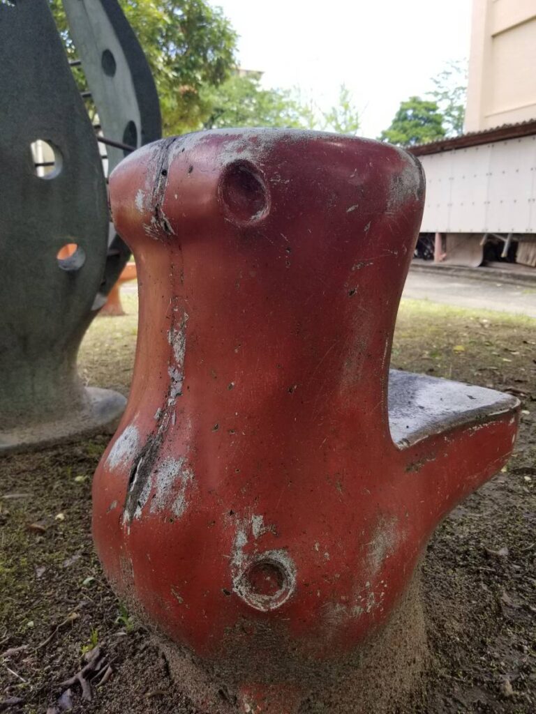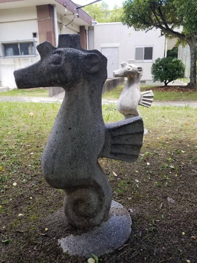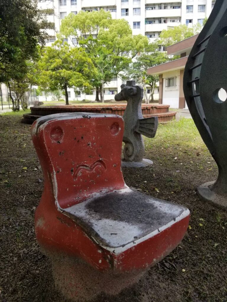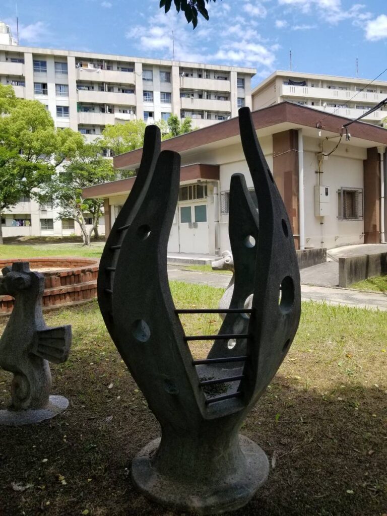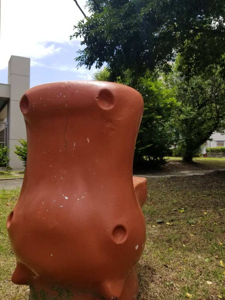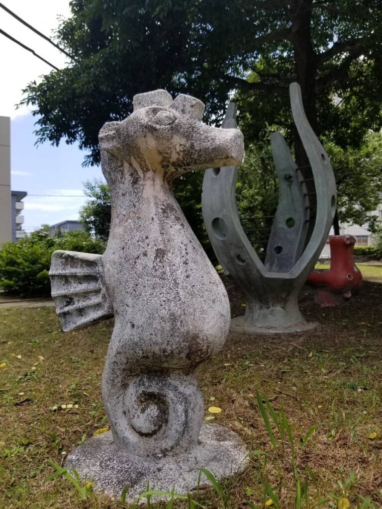 こちらの公園は健康遊具が充実しています。市民の健康維持ができる元気な街づくりを目標に整備されたそうです。その健康遊具の近くの木陰にはコンクリート?で作られたオブジェ?がいくつもあります。見つけてみて下さい。